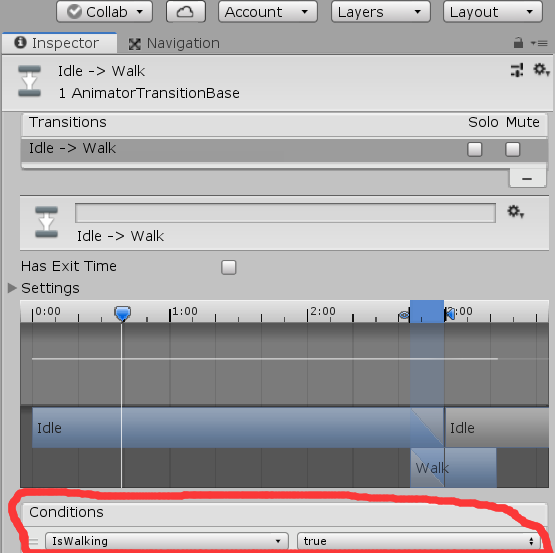其中的Has Exit Time一般取消选择,意思为会在确定的时间进入下一状态,当前情况下是需要判断IsWalking是否为true来进入下一状态
